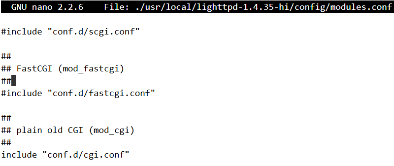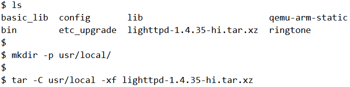 Within the mtd/app directory there’s a lighttpd-1.4.35-hi.tar.xz file which contains the configuration file for lighttpd. We can extract that to usr/local within the chroot directory.