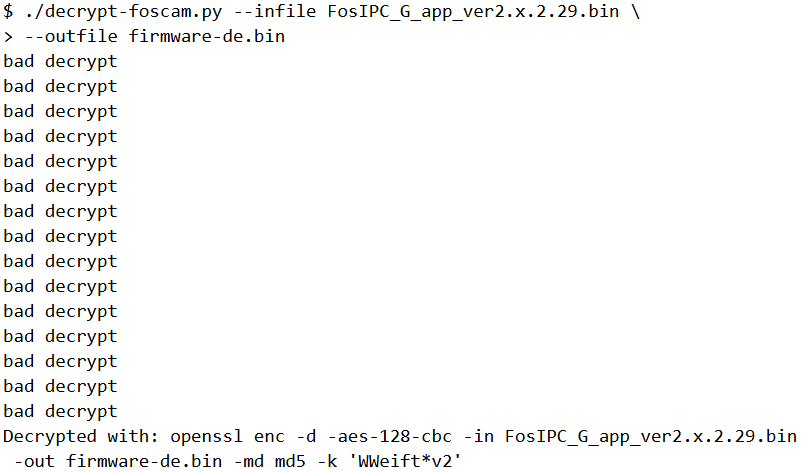 Searching for “foscam firmware decrypter” leads us to this script (https://github.com/mcw0/PoC/blob/master/decrypt-foscam.py). Running the script on our encrypted firmware we get back the decrypted one.