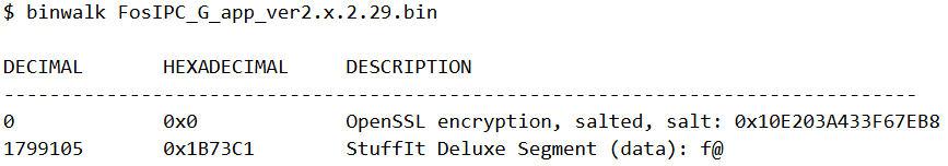 We will use binwalk for inspecting the firmware package. It’s a tool for analyzing, reverse engineering and extracting firmware images. Binwalk is generally used for firmware analysis but can also be used on any unknown files. Running binwalk reveals that the firmware package is encrypted. To proceed we need to decrypt it.