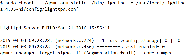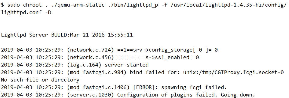 Qemu no longer segfaults but lighttpd still exits as it was not able to spawn CGIProxy.fcgi. As a workaround, we can try disabling fcgi altogether. We can edit the configuration file modules.conf and comment out the line include "conf.d/fastcgi.conf" as shown.