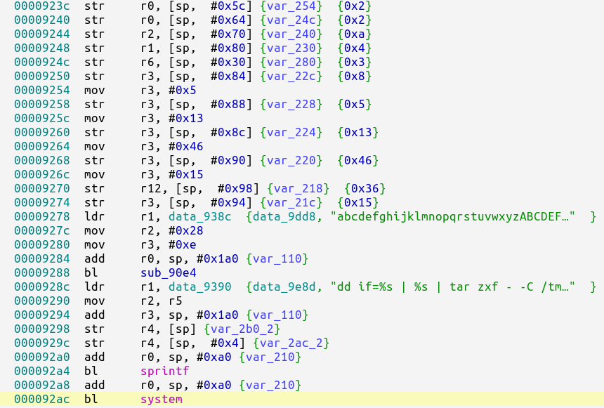 If we look at the string passed to sprintf we can notice there are several %s placeholders. The final command which is passed to system is generated at runtime. This is done just to hide the actual command from appearing with a simple strings scan.
