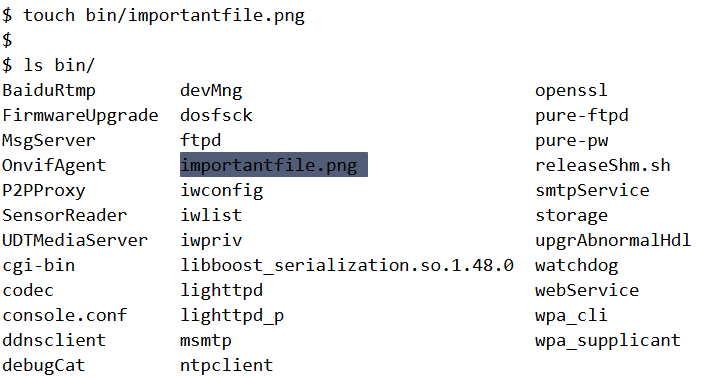 Indeed, if we do a directory listing of /bin, we can notice that importantfile.png is missing.