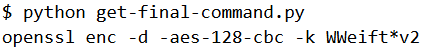 From the output of the script we can infer that the firmware binary is encrypted using the AES cipher with a block size of 128 in CBC mode. The key for decryption is WWeift*v2. We will again see this password a bit later.