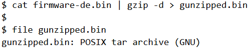 Gunzipping it reveals it’s a tar archive. So essentially firmware-de.bin is a tar.gz archive.