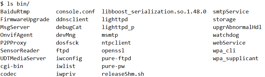 The extracted firmware does not contain a full linux file system. For instance there’s no /etc directory. As a result we cannot use Firmadyne for emulation. However that does not stop us from using qemu user-mode emulation to run the individual binaries.