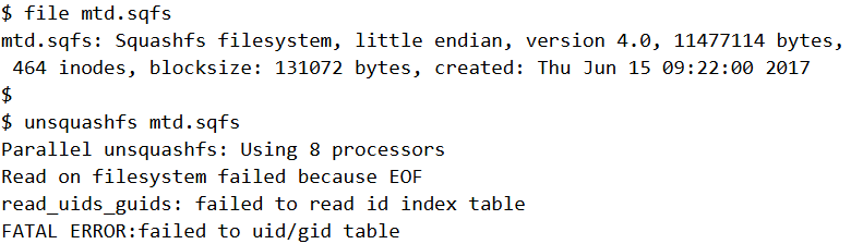 This is the same password which had obtained from the firmware decryption script. mtd.sqfs is a SquashFS file system. However, on trying to extract using unsquashfs it fails.