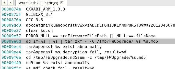WriteFlash is 32-bit ARM ELF. It’s purpose is to update the firmware on the IP camera after being uploaded. Analyzing in Binary Ninja we can find few occurrences of decryption related strings.