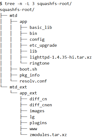 The extracted files looks something like below (shown upto three folders deep). Within squashfs-root, there are two directories - mtd and mtd_ext.