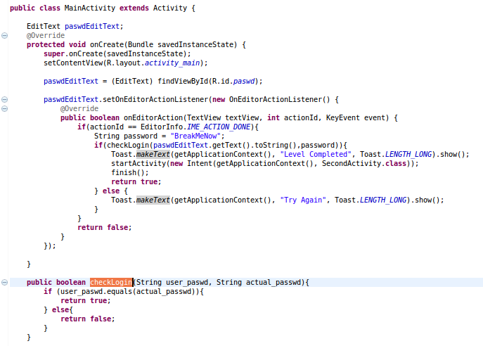 We bypass the validation functionality by making both the strings as equivalent before entering the checkLogin method. As a result, the equals check in the function will always return true as both the strings now being passed to this method are same. Voila! Few more steps and we will accomplish the target of hooking.