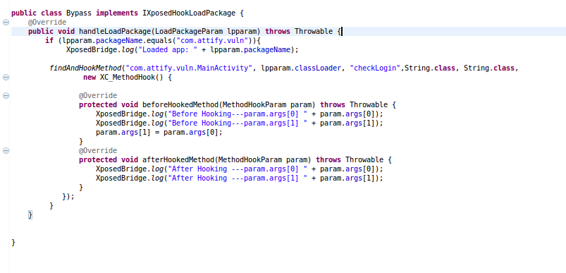 The easiest way to bypass this functionality is to force the method checkLogin to return true somehow. We can now get back to Eclipse where hooking module is waiting for us.